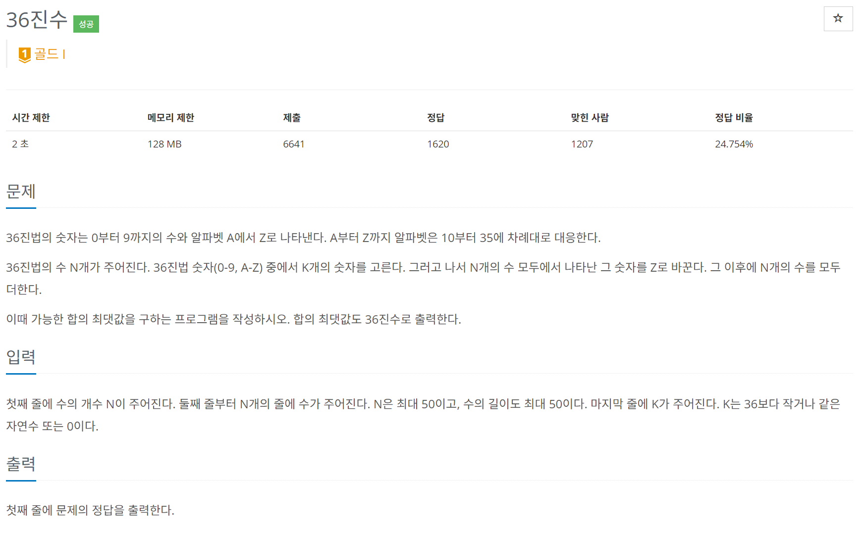 주어진 입력 중 Z로 k개 만큼 바꾸고 모두 더한 값이 최댓값이 되게 구하고, 그 값을 36진수로 변환하여 출력