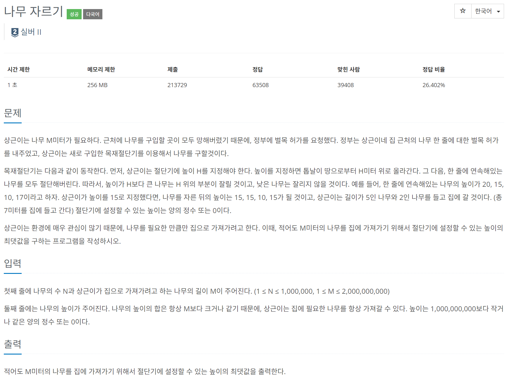// 적어도 M미터의 나무를 집에 가져가기 위해서 절단기에 설정할 수 있는 높이의 최댓값
