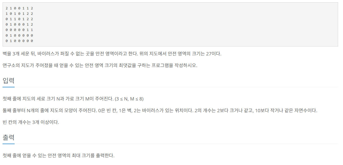 전체 크기 - (벽의 개수 + 새롭게 세운 벽 3개 + 바이러스 개수의 최솟값) 이 안전구역의 최댓값이다.