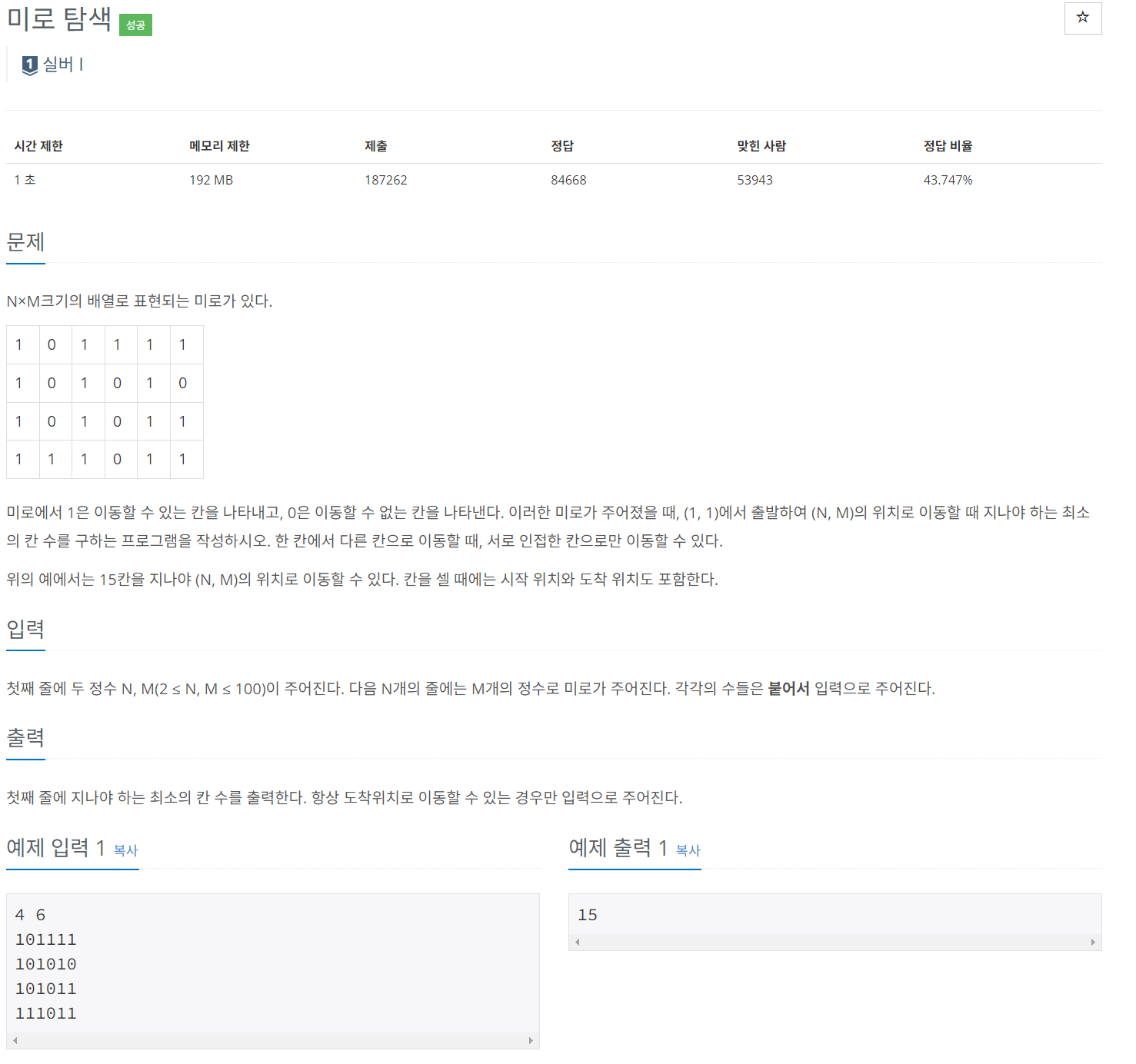첫째 줄에 두 정수 N, M(2 ≤ N, M ≤ 100)이 주어진다. 다음 N개의 줄에는 M개의 정수로 미로가 주어진다. 각각의 수들은 붙어서 입력으로 주어진다.