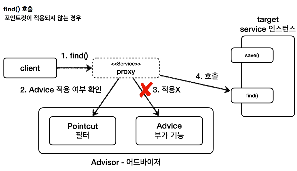 포인트 컷 필터를 통과하지 못할 경우 proxy는 advice를 적용하지 않고 target의 메서드를 호출한다.