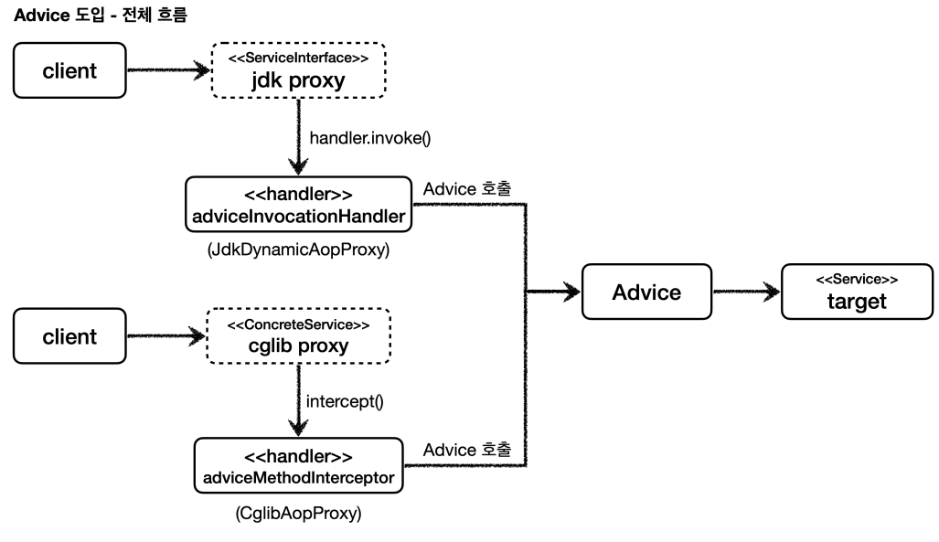 프록시 팩토리를 사용하면 Advice를 호출하는 전용 InvocationHandler, MethodInterceptor 를 내부에서 사용한다.