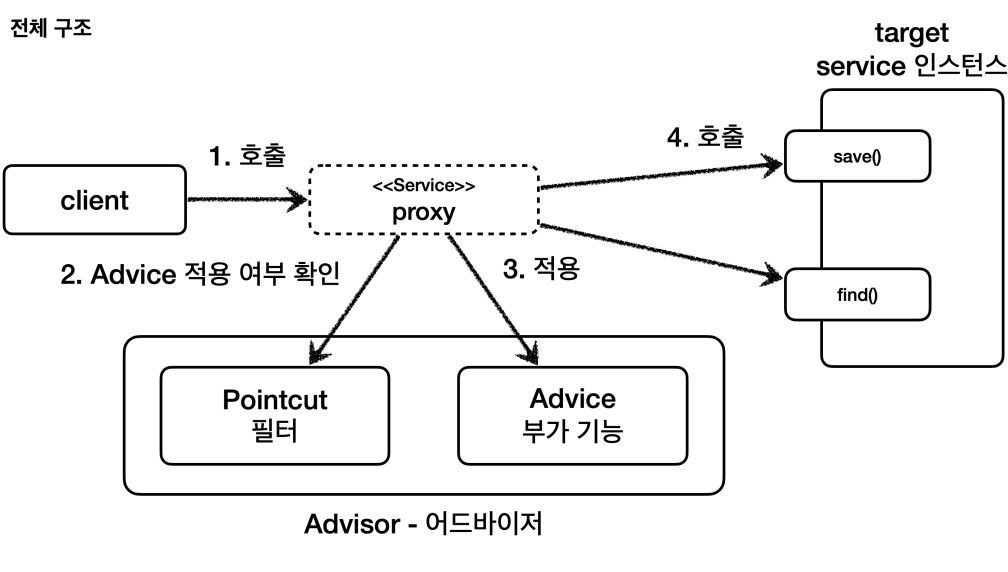 어드바이스(Advice) : 프록가 호출하는 부가 기능 (프록시 로직)