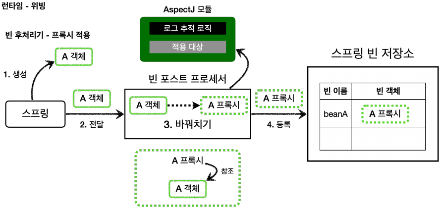 - AOP적용을 위해 애스펙트를 객체에 연결한 상태