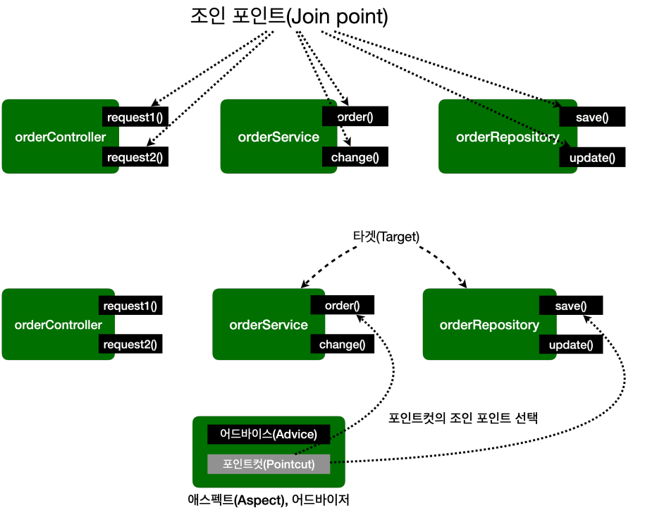 - 이렇게 AOP를 적용할 수 있는 지점을 조인 포인트(join point)라 한다.