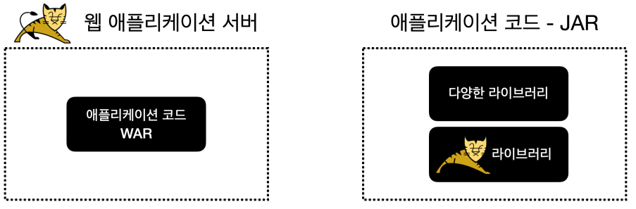 WAS 안에 애플리케이션 코드 (외장 서버) vs 애플리케이션 안에 WAS (내장 서버)이다.
