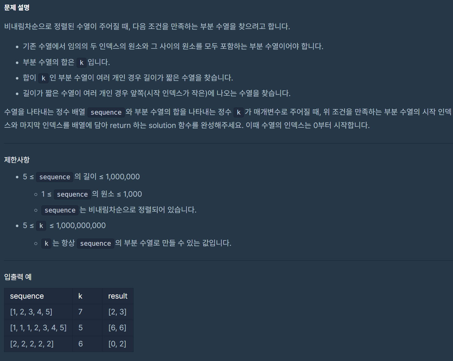 투 포인터의 합계가 k와 같다면 앞 포인터 인덱스 - 뒤 포인터 인덱스 한 값이 짧은 길이의 수열 인덱스 배열과 비교하여 가장 짧은지 확인하는데 같다면 넘어가고, 더 짧다면 갱신해주면된다.
