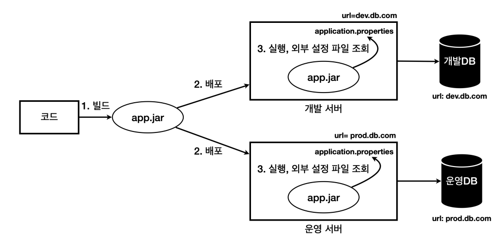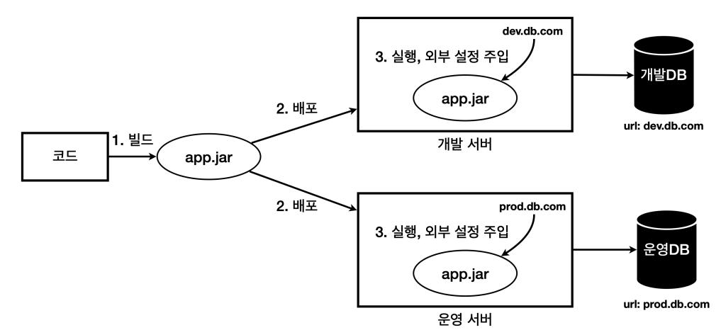 따라서 우선 빌드를 하고 배포 후 실행 시점에 외부 설정을 주입하는 것이다.
