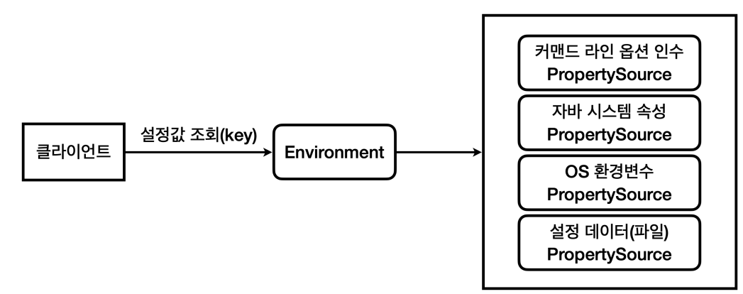 스프링은 PropertySource 라는 추상 클래스를 제공, 각각 외부 설정을 조회하는 XxxPropertySource 구현체 만듦