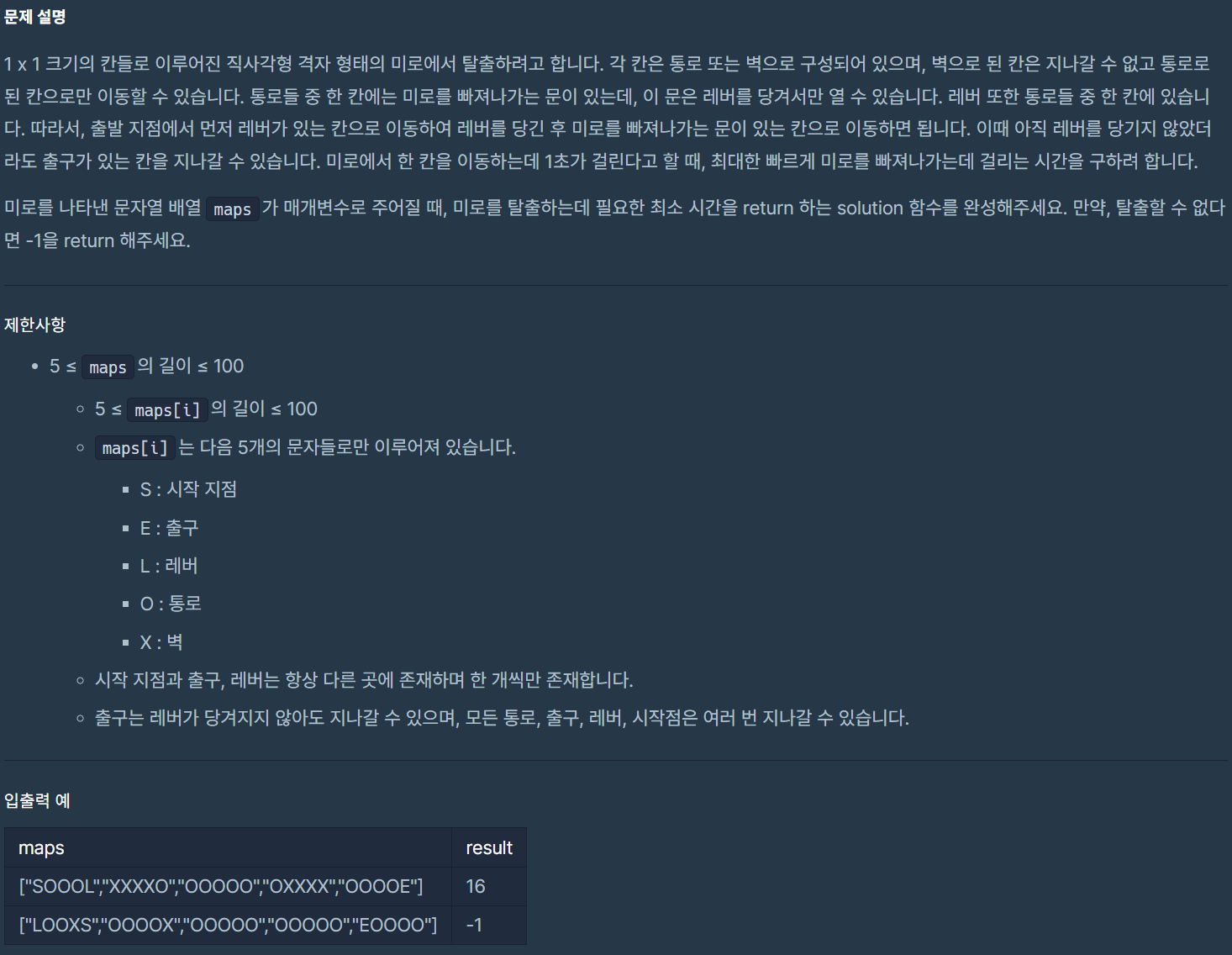 bfs(maps, new int[] {i, maps[i].indexOf("S"), 0}); // r, c, 걸린 시간