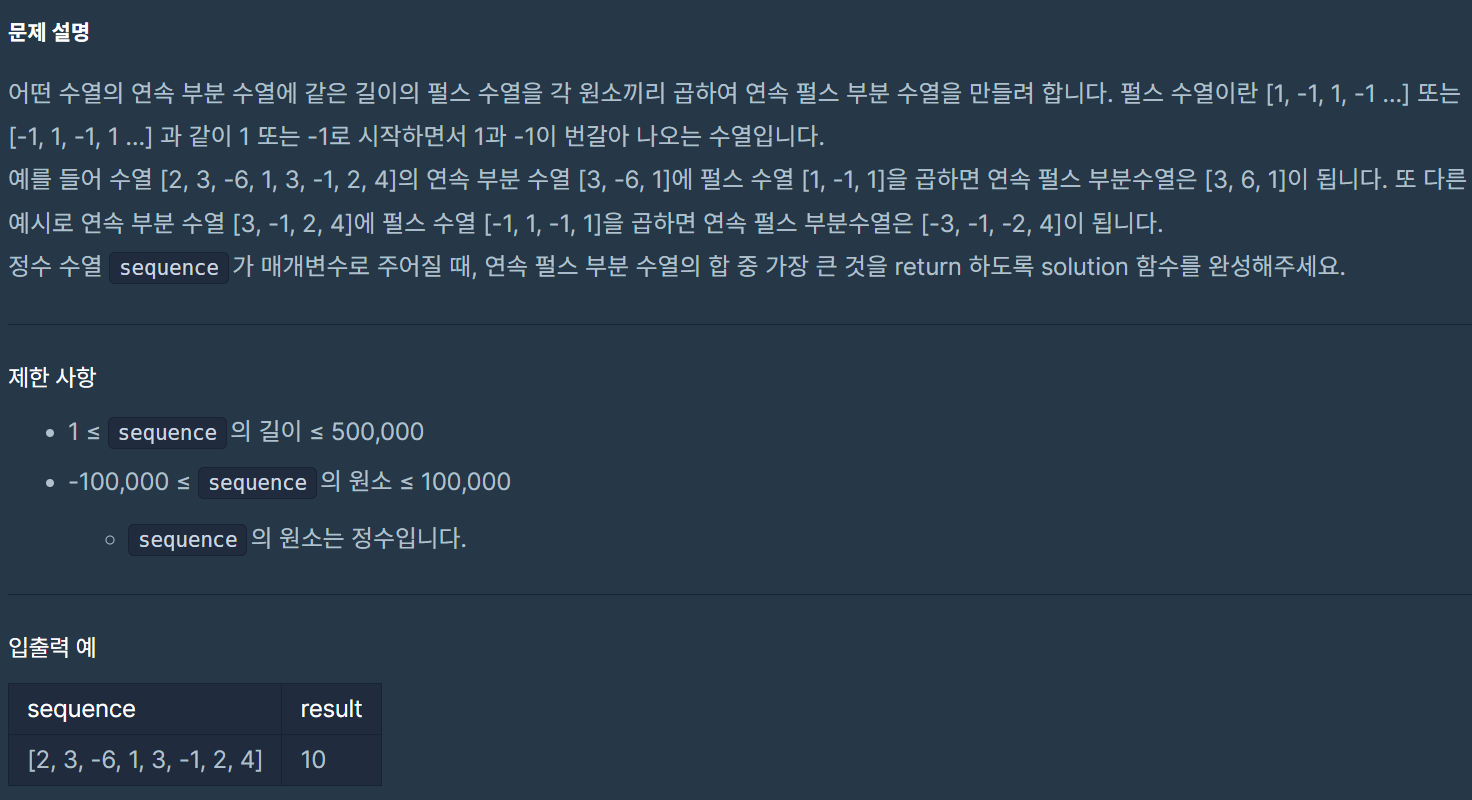 나는 잘못 이해해서 펄스 수열 처럼 수열의 연속 부분수열이 3,-6,1,-4 이런식으로 1,-1 이런 패턴이 유지되는 연속 부분 수열에만 펄스 부분 수열 1,-1을 곱해서 양수가 되는 것만 합쳐서 최댓값을 구했다.