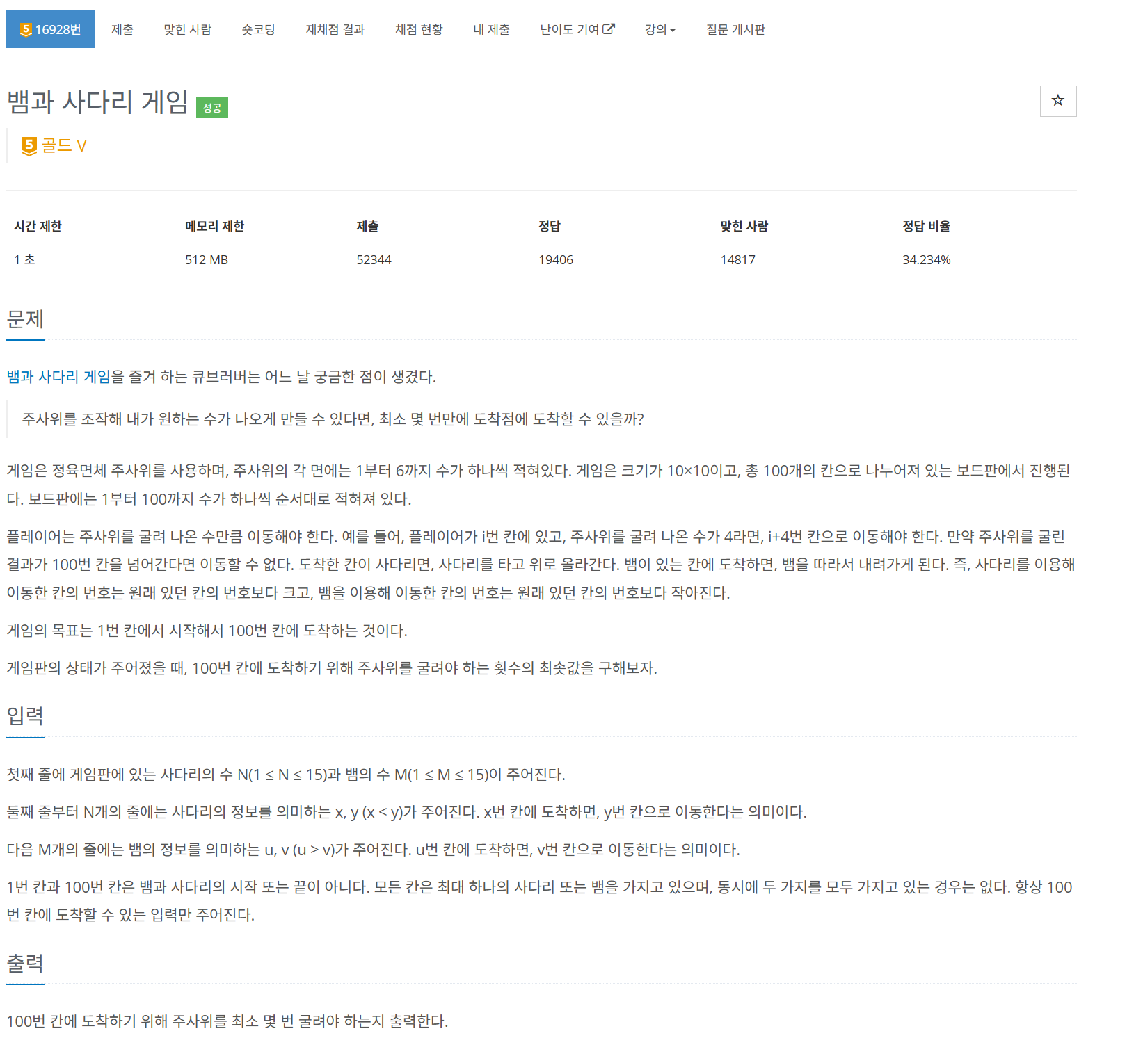 // 주사위를 던져 이동한 곳이 사다리 나 뱀이면 이동