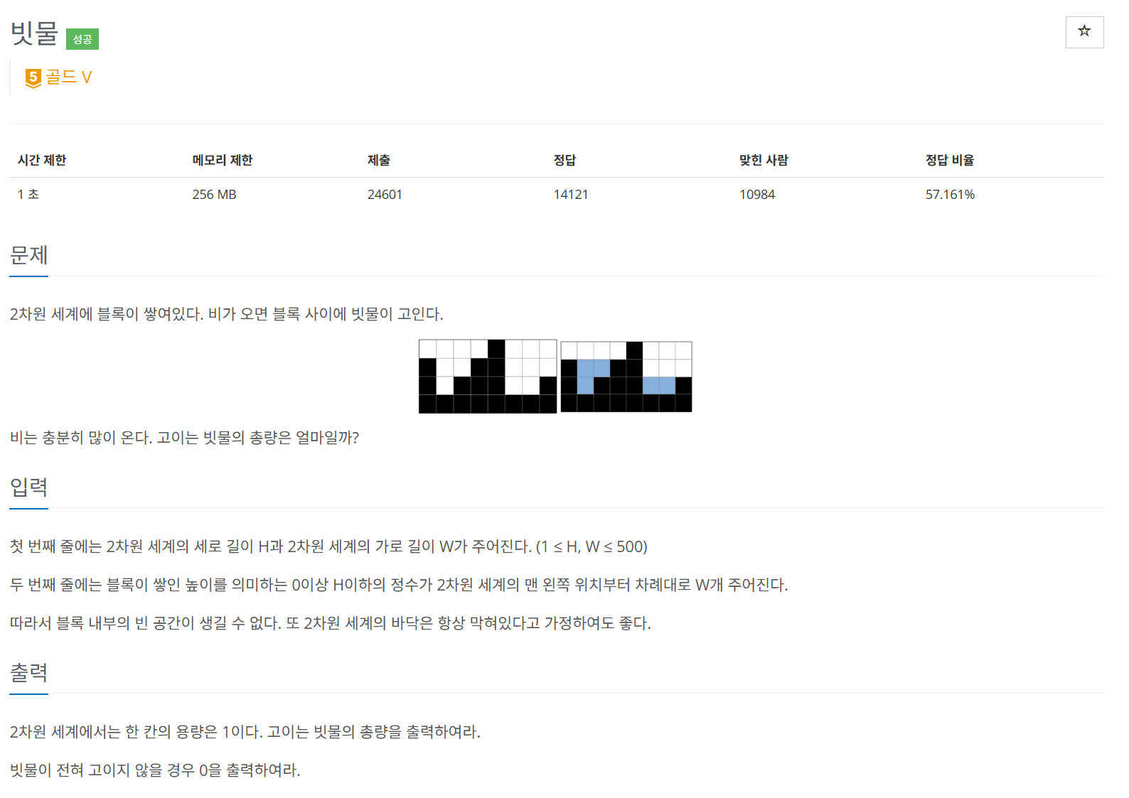 우선 왼쪽 포인터(left)를 기준으로 잡고, 오른쪽 포인터(right)를 하나씩 이동하면서 right 위치의 블록이 left보다 작으면 스택에 담아두고, left보다 크거나 같아지는 순간이 오면 left와 right 중 작은 값을 min으로 설정한 뒤, 스택에서 블록들을 꺼내 min - stack.pop()을 answer에 누적합했다. 이 과정을 반복하면서 빗물이 고일 수 있는 공간을 계산했다.