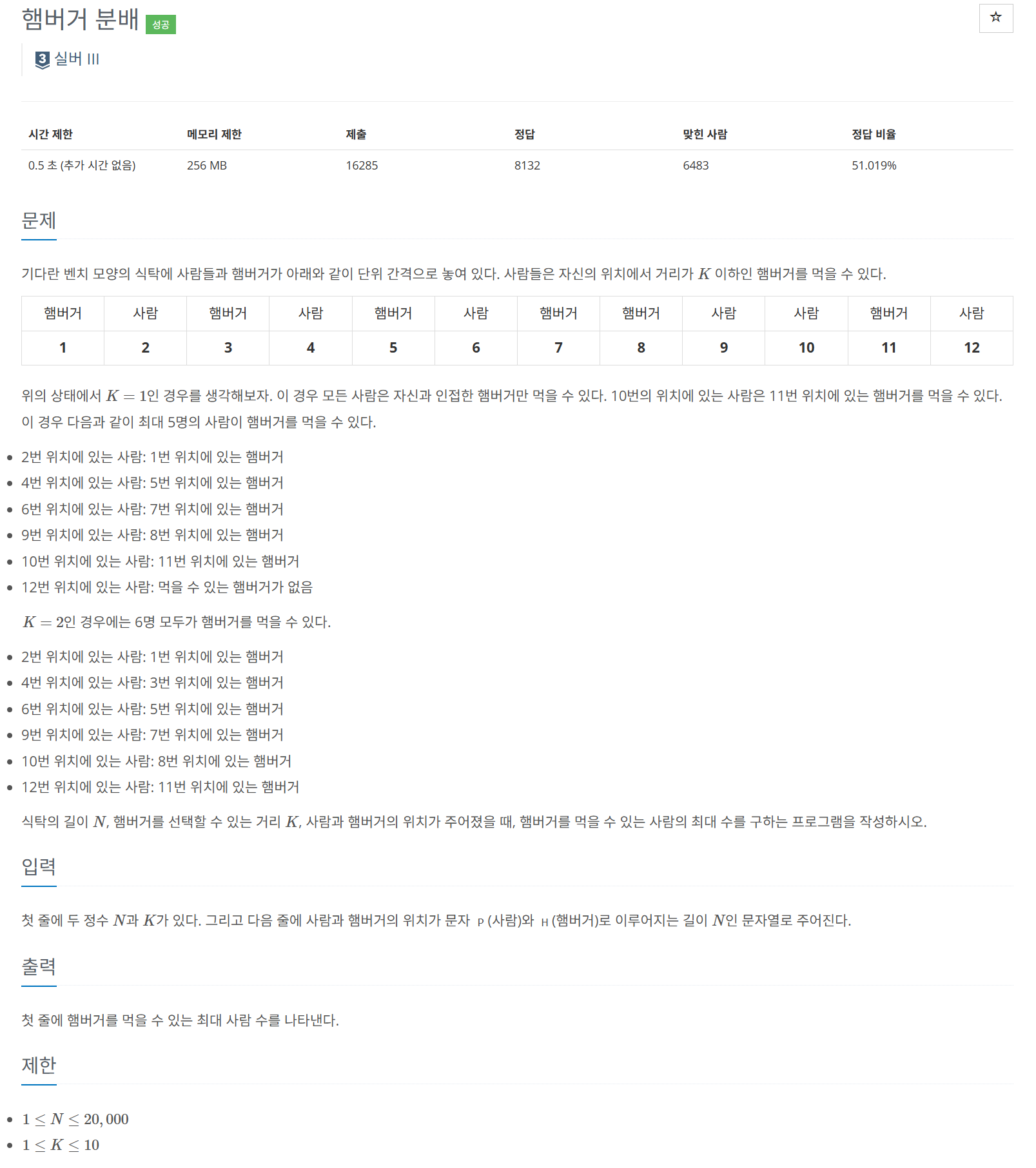 따라서 앞의 사람이 현재 위치-k ~ 현재 위치 + k 까지 탐색해서 앞쪽에 있는 아직 안먹은 햄버거가 있다면 먹는다.