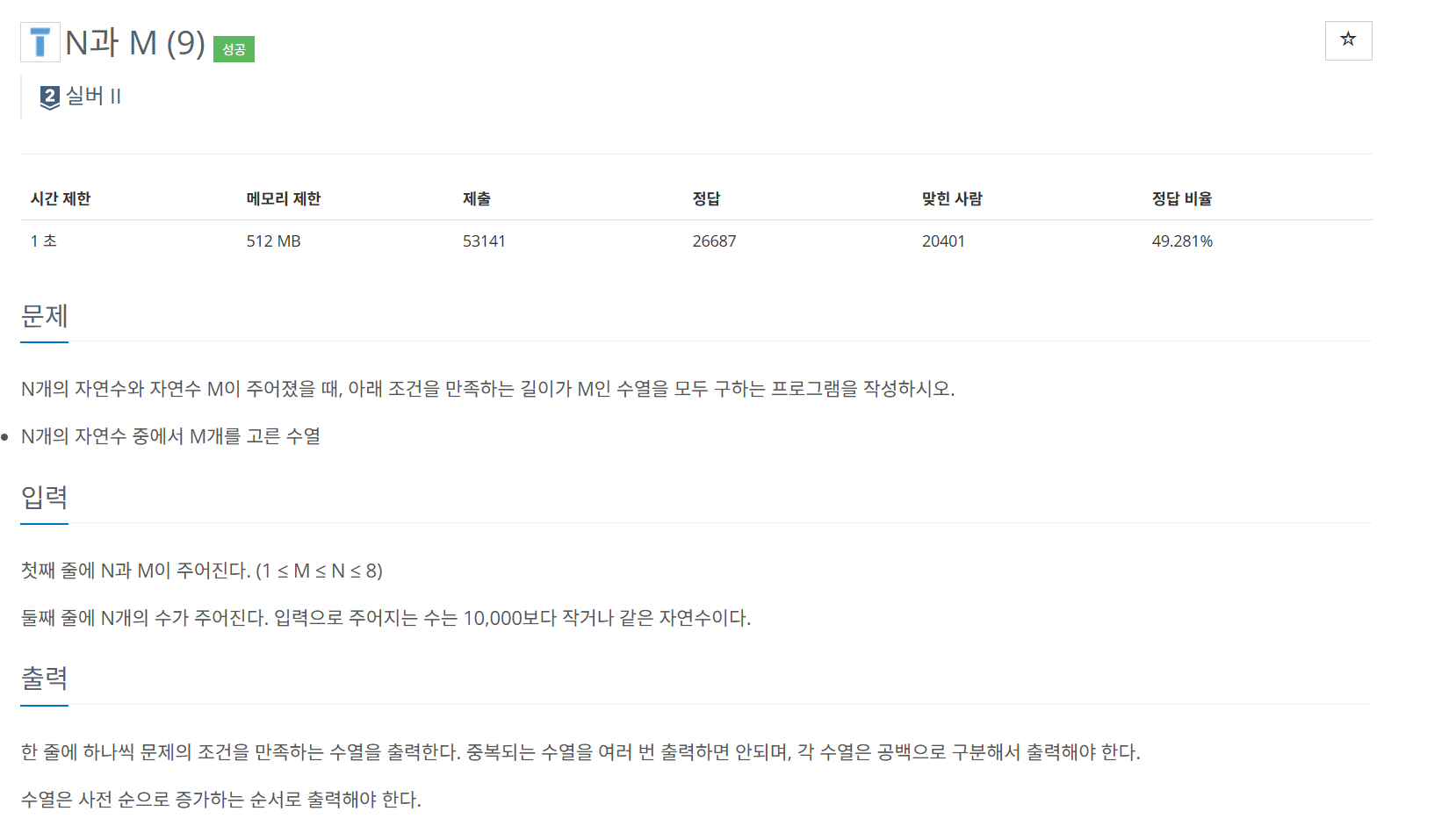 N개의 자연수 중 M개를 고른 수열이면서 그 수열이 중복되면 안된다.