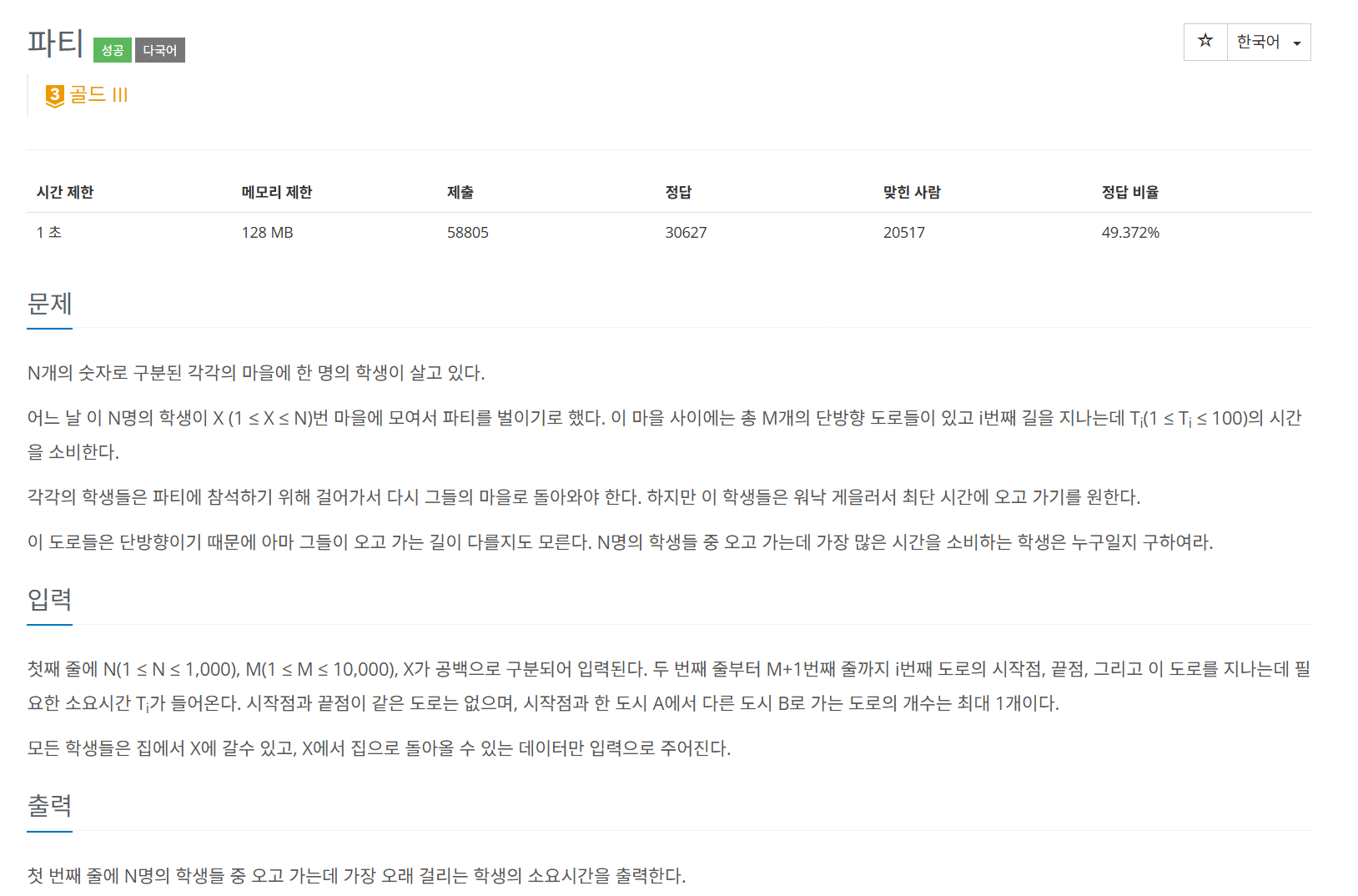 각 정점에서 다익스트라 알고리즘을 돌려서 X까지의 값을 구하는 식으로 했다.