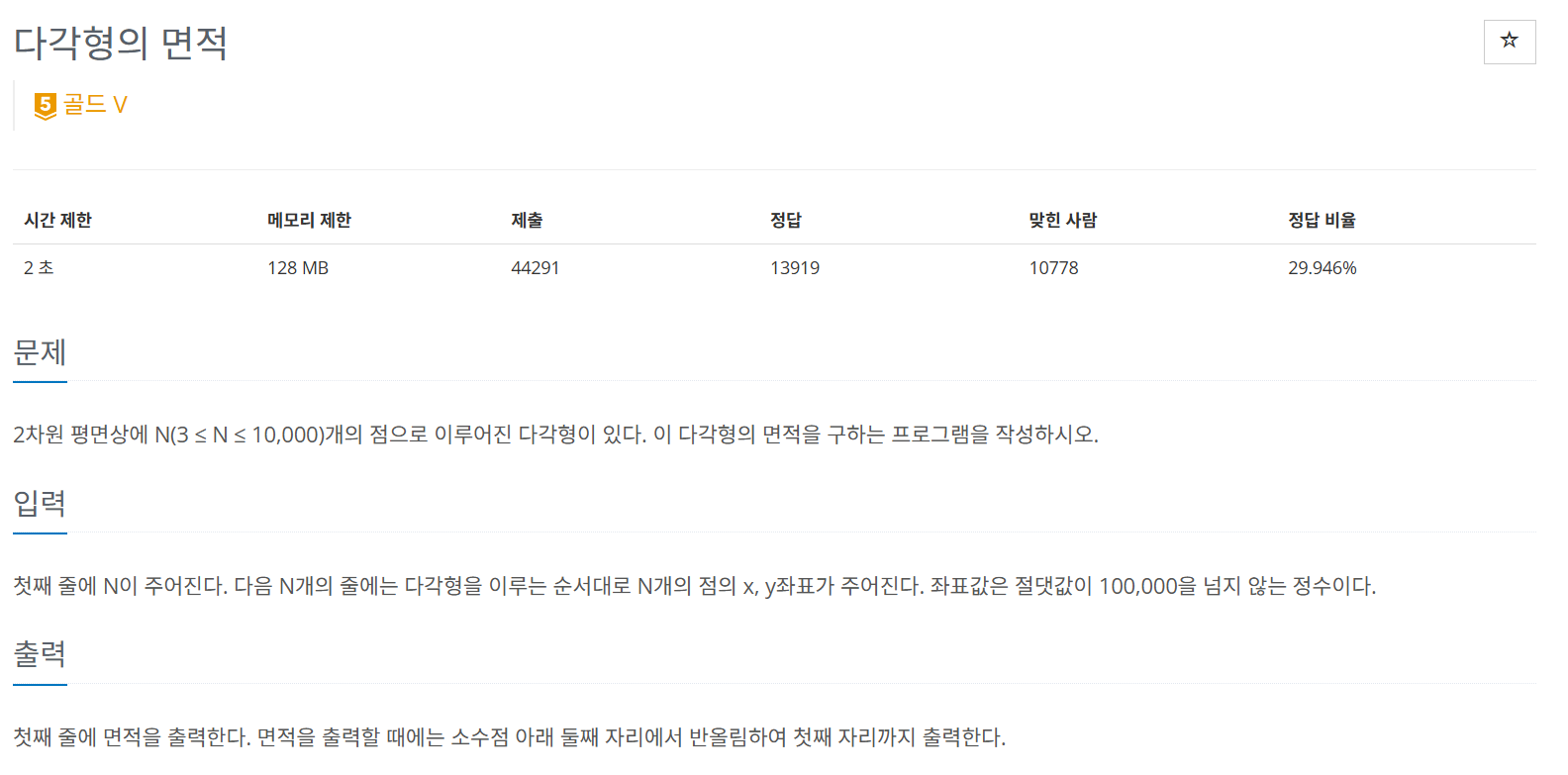 문제에서 다각형을 이루는 순서대로 N개의 점 좌표가 주어진다하였으므로 그대로 신발끈 공식을 적용한다.