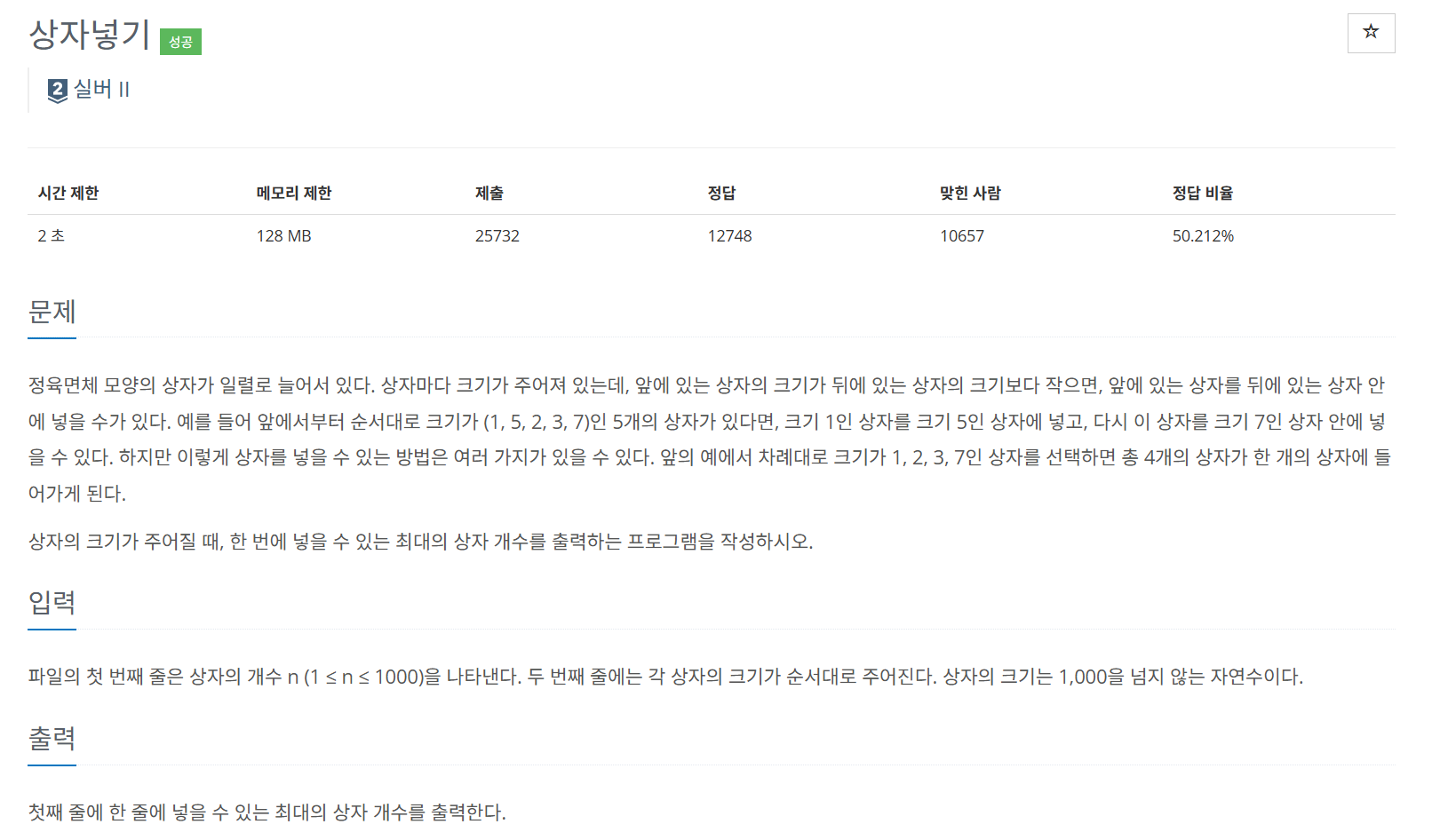 dp[i] = 1; // 각 상자들은 현재 최대 1개의 상자를 넣을 수 있다 (즉 자기 자신)