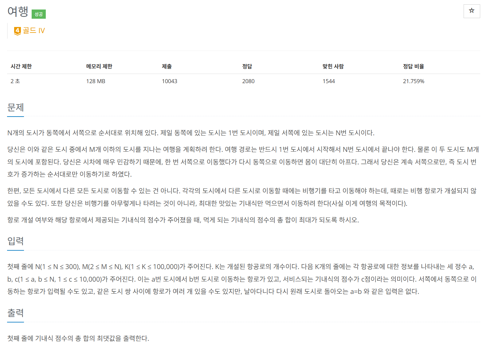 - 처음에 방문하지 않았다면 dp[a][j] = 0으로 했는데 정말 잘못된 풀이였다. 예를 들어 2 -> 3 10000 으로 3이 끝이라 했을때 이때 기내식 점수는 최댓값이라 해도 1에서 2로 가는 경로가 없다면 이 경로로는 불가능하다.