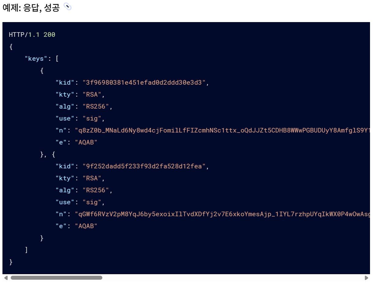 해당 주소에 요청을 보내면, 실제 RSA 공개키 정보(n, e 등)를 포함한 JWK 리스트를 얻을 수 있다.