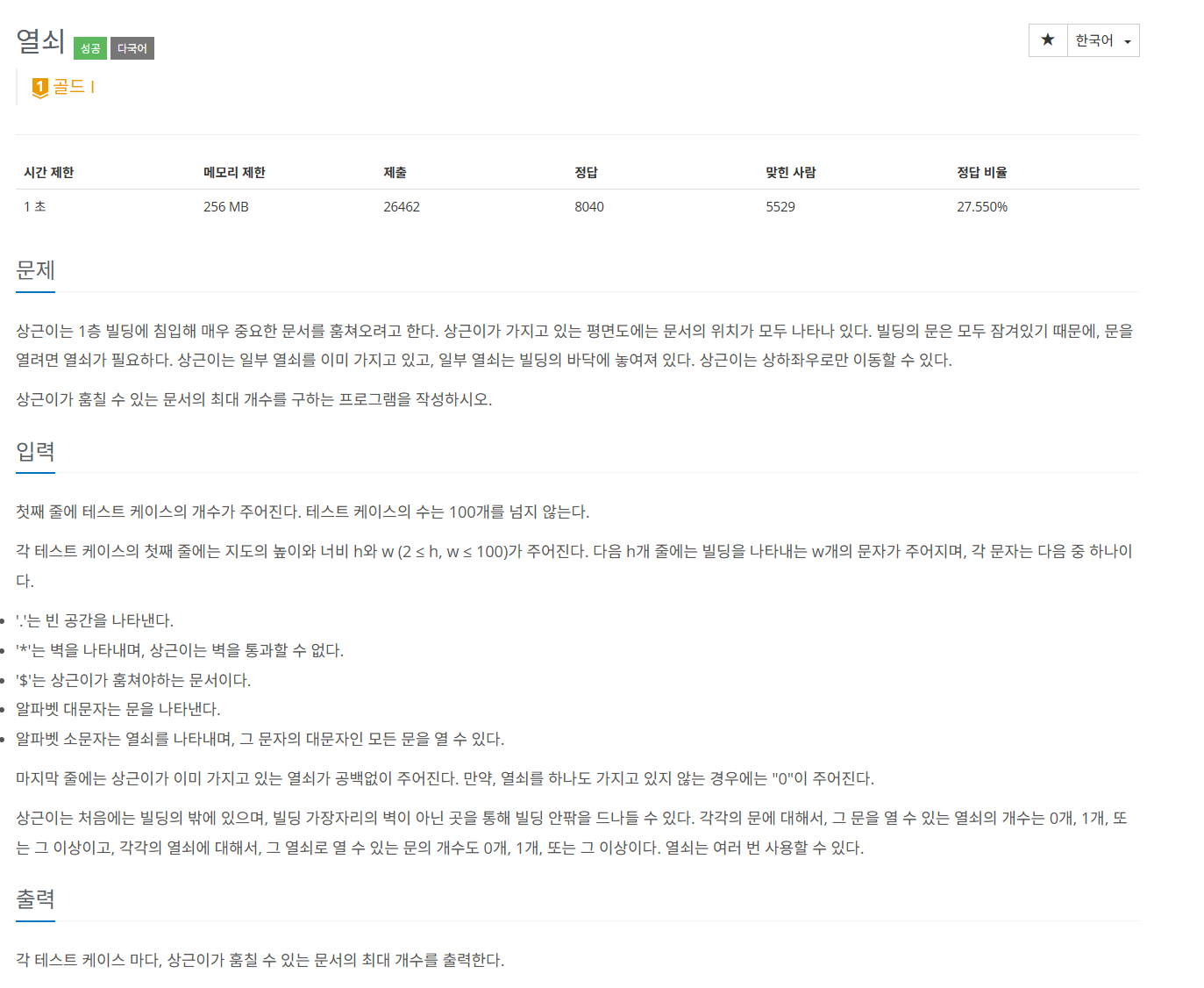 // 3. 1번 탐색이 끝났다면 갖고 있는 키로 열 수 있는 문이 있으면 탐색하기위 해 큐에 저장하고 1번부터 다시 시작