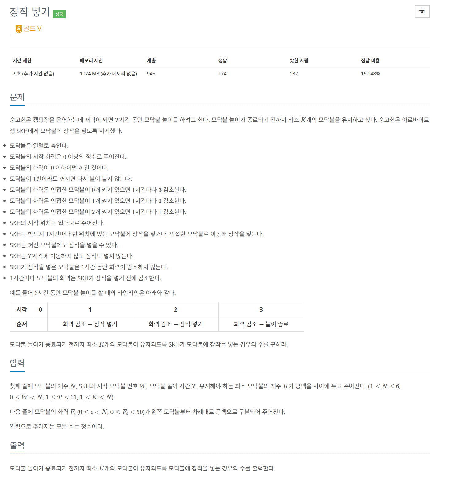 int T = Integer.parseInt(st.nextToken()); // 모닥불 놀이 시간 <= 11