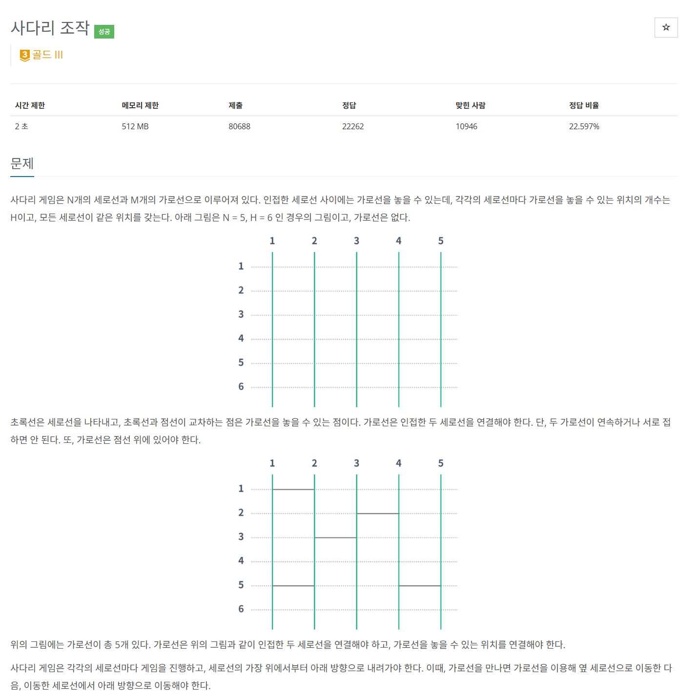 // 연결 여부는 왼쪽 사다리 기준 H개의 가로선, N개의 세로선