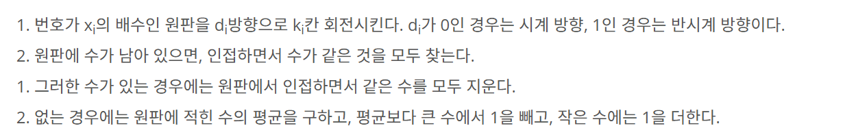 인접하면서 수가 같은 것을 모두 찾는다 -> 돌려진 상태에서 모든 원판의 인접하면서 수가 같은 것을 모두 찾는다.