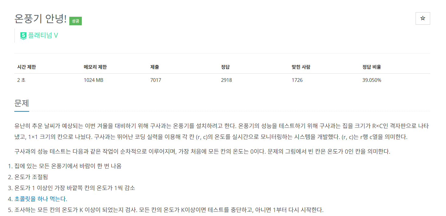 // 5. 조사하는 모든 칸의 온도가 K이상이면 중단, 아니면 1번부터 다시