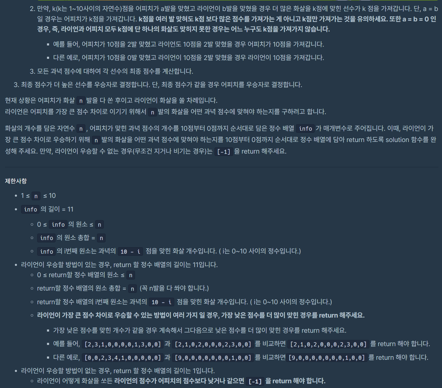 또한 정답 후보를 통해 어피치의 점수와 라이언의 점수를 구하여 비교한다. 만약 어피치 점수 >= 라이언 점수라면 정답이 없으므로 -1을 반환한다.