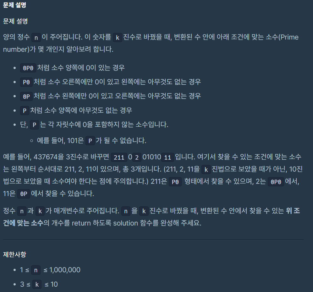 문제에서 k진법으로가 아닌 10진법으로봤을때 소수여야한다고 되어있는데 이는