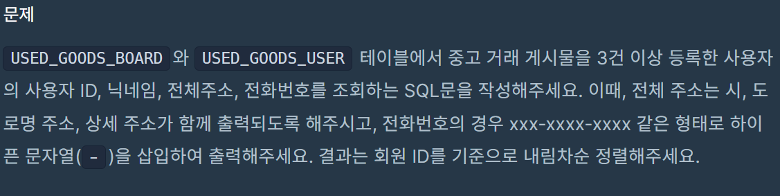 첫 번째로 중고 거래 게시물을 3건 이상 등록한 사용자를 필터링해야한다.