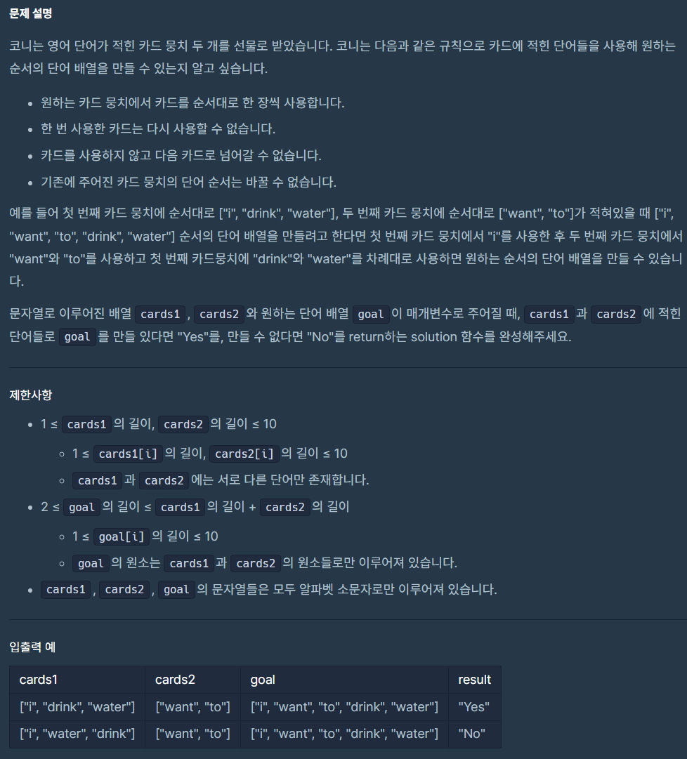 2. 조건에서 goal의 길이 >= cards1 + cards2