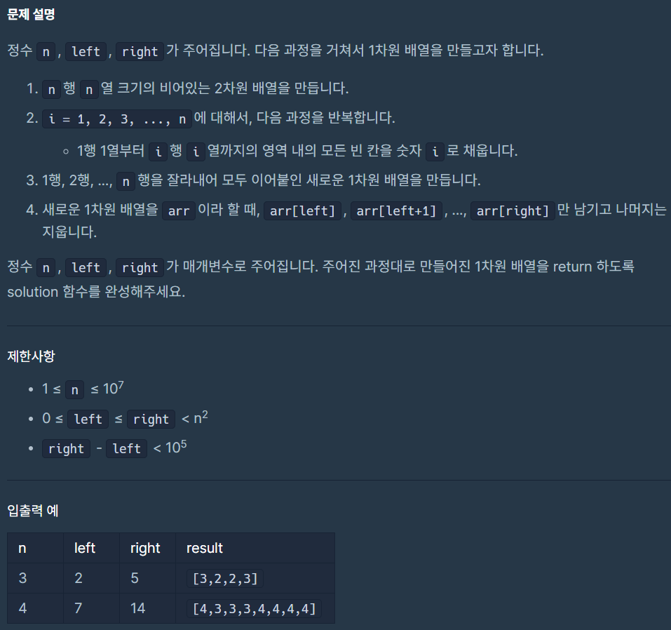 1차시도때 2차원 배열 만들고 값을 하나씩 넣은다음 그 중에서 left~right 배열을 반환하려 했으나 보면 알겠지만 n의 값이 최대 10^7이고 right - left 는 10^5 미만이다. 2차원 배열을 만들 경우 n *n 인 10^14크기의 배열을 만들어야하므로 메모리 초과가 뜬다.