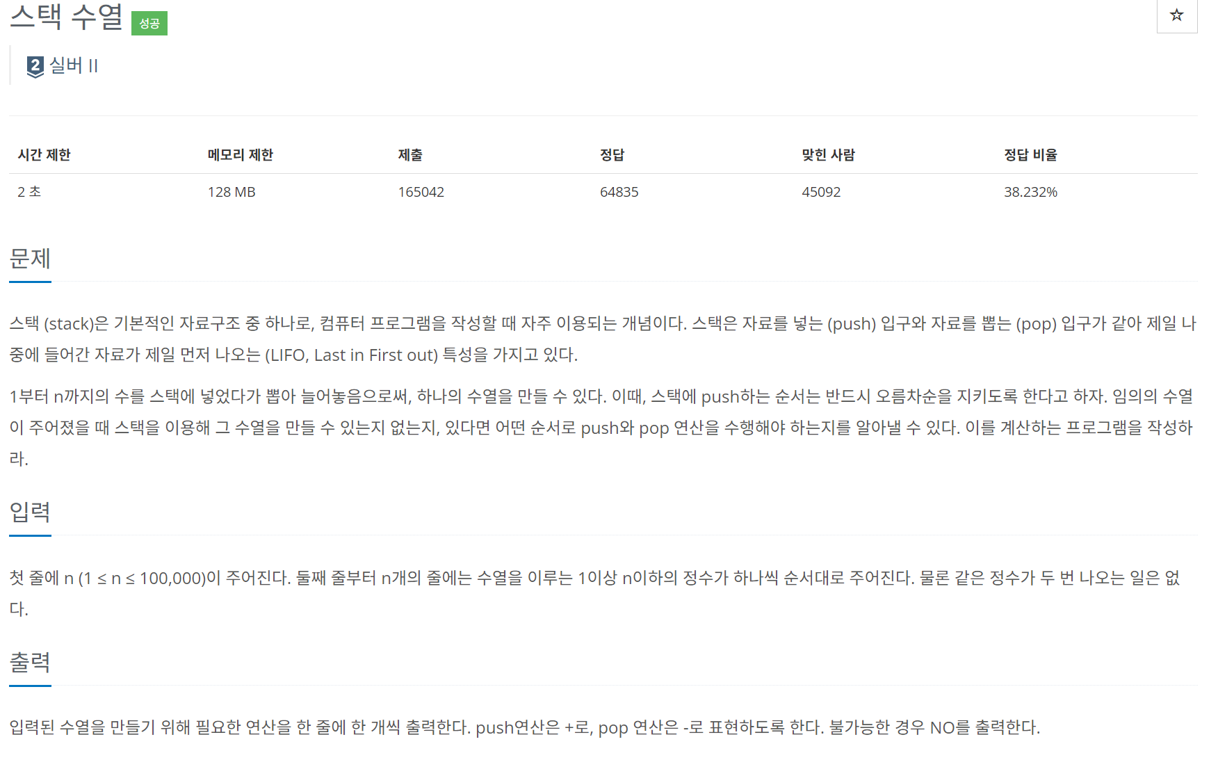 즉 수열의 각 순서에 따른 수만큼 push하고 top의 수가 현재 순서의 수면 pop하고 아니라면 NO를 출력하고 중단한다.