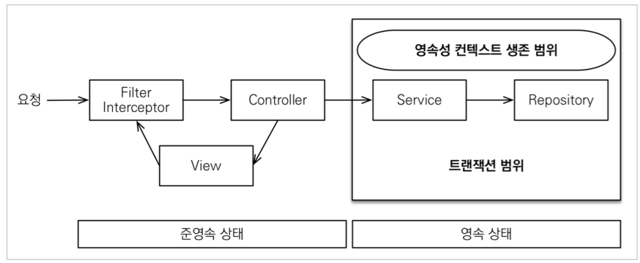 최초 데이터베이스 커넥션 시작 시점부터 API 응답이 끝날 때 까지 영속성 컨텍스트와 데이터베이스 커넥션을 유지