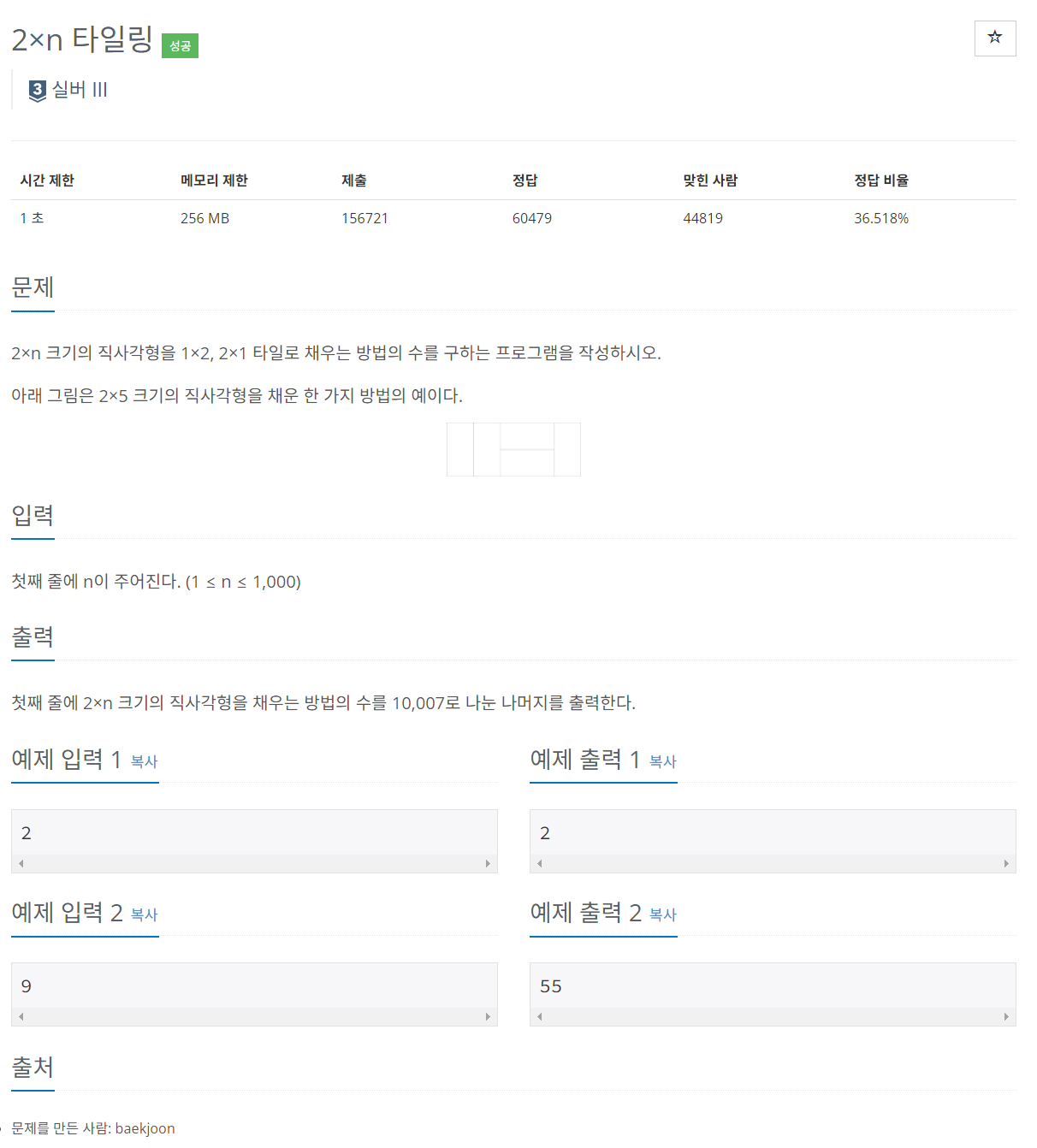 2x1의 경우 2x1타일 하나로 채우는 방법 한 가지만 있다.