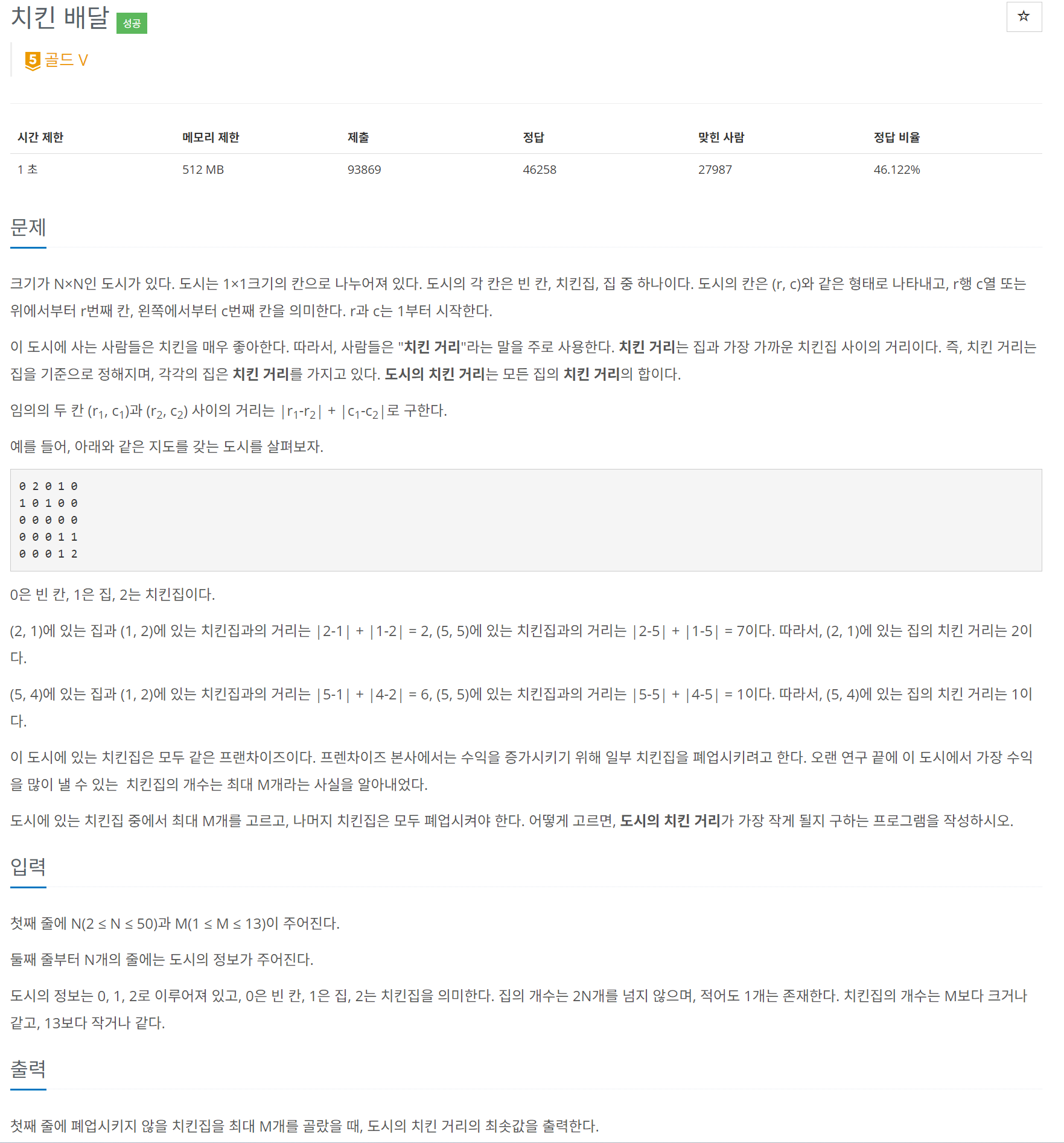 중요한 것은 m개의 치킨집을 효율적으로 뽑아서 치킨거리를 계산하는 것이다.