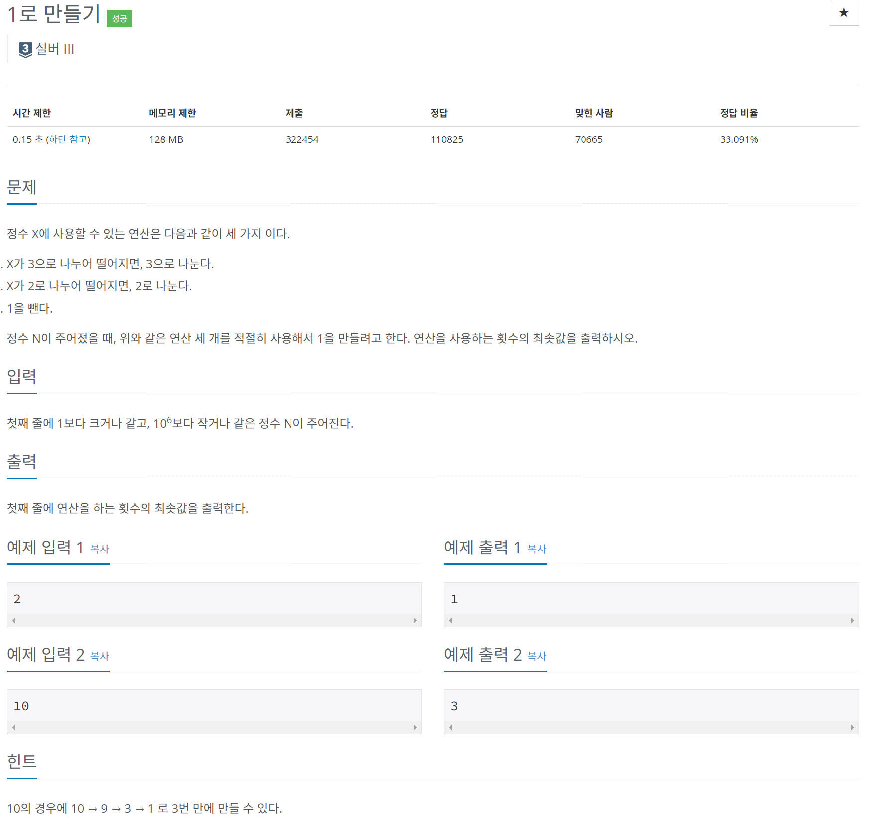 6 / 3 의 최솟값 dp[6 / 3] + 1,