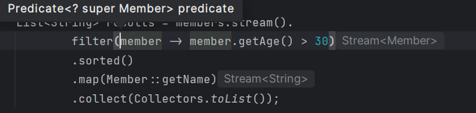 연산반환 형태연산 인수| filter | Stream<T> | Predicate<T> |