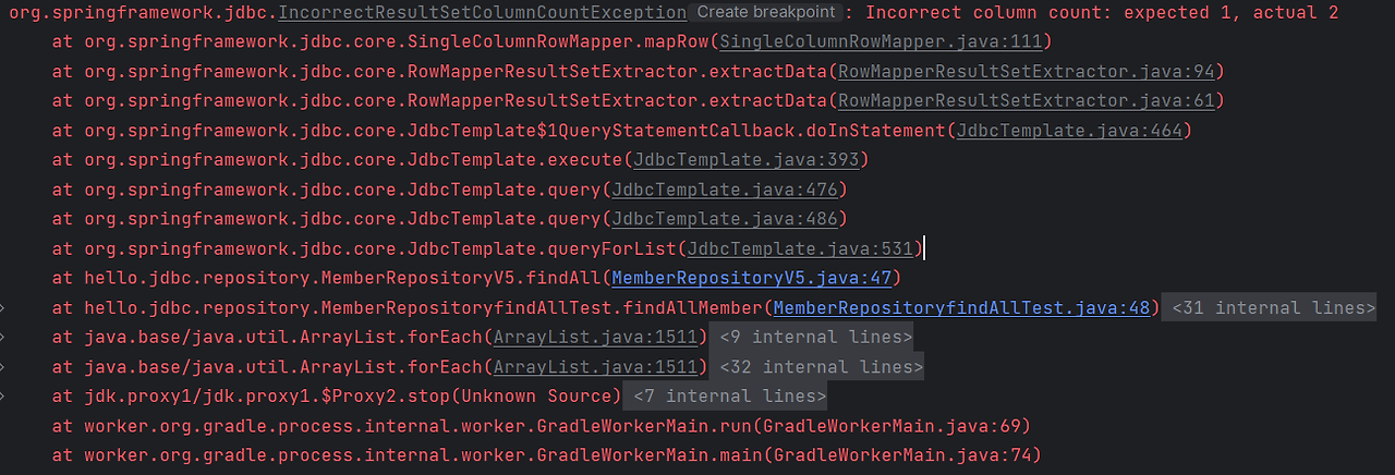 IncorrectResultSetColumnCountException 예외가 터졌다