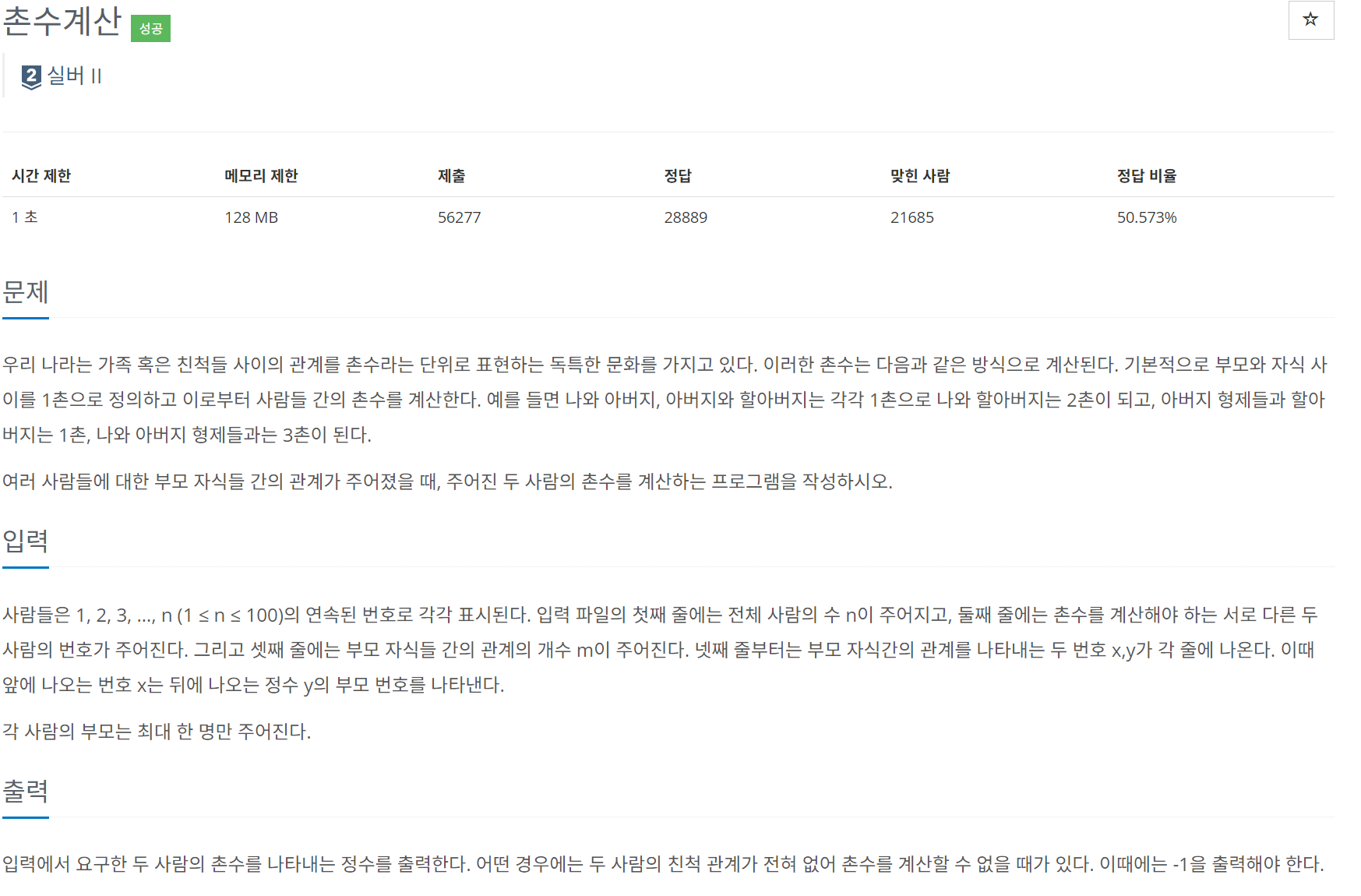 부모와의 관계를 문자열로 저장하고 각 각 비교하면서 촌수를 따졌는데 이렇게하면 너무 오래걸리고, 이상하게 중복이 생겼다. 푸는 방향이 잘못되었던 것이다. 이 문제에서 원하는건 그래프와 넓이 탐색에 대한 개념을 잘 이해하는지를 물어보는 문제였고 나는 제대로 이해하지 못했어서 이상하게 풀이를 시작한 것이다.